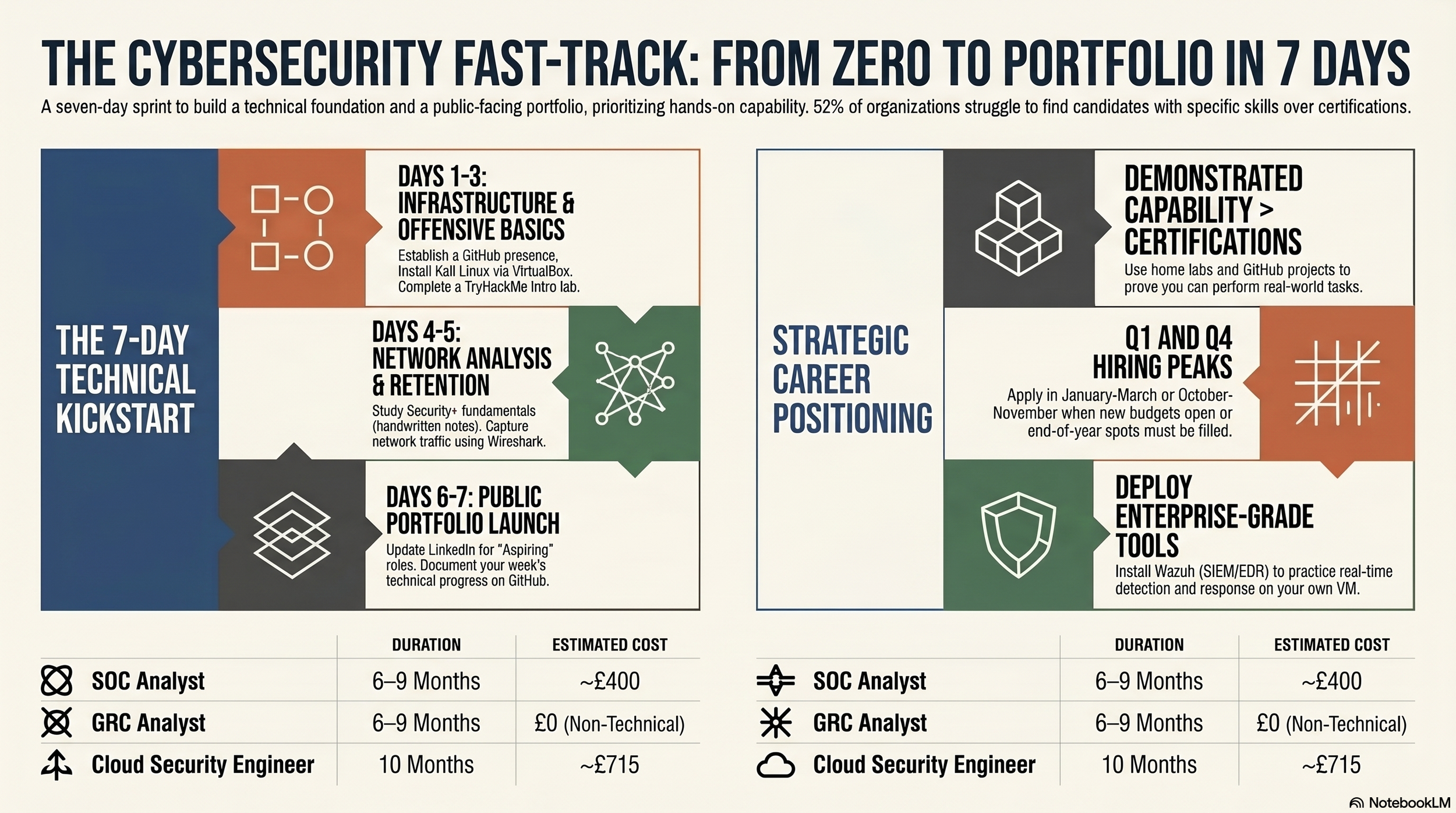 Plan backwards from your target application date. If you want to be ready by October, start your Security+ study now. Build your home lab in the summer. Have your portfolio polished by September.